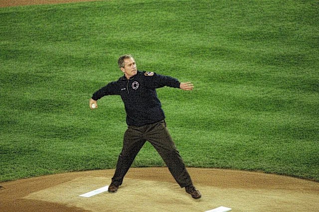 At game 3 of the World Series in October 2001, the Yankees hosted the Arizona Diamondbacks in New York. The first pitch, which usually happens well before most of the crowd arrives, is seen by the sold-out stadium and felt by the nation. Newly-elected-president George W. Bush comes out of the dugout in an FDNY pullover (which not just showed support for the first responders, but also concealed a bulletproof vest). He waves to the crowd, throws a strike, waves again, then is escorted off the mound by “USA” chants.